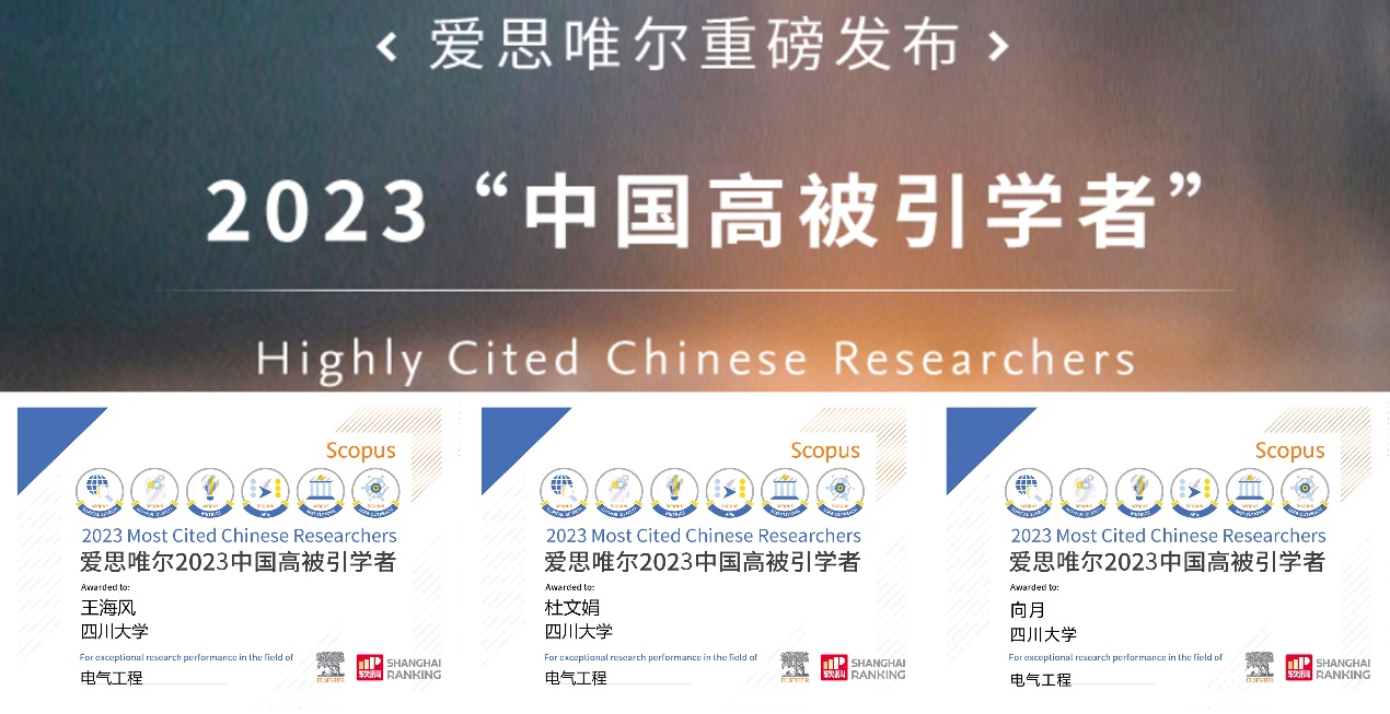 2024年3月27日,爱思唯尔 (Elsevier) 重磅发布2023“中国高被引学者” (Highly Cited Chinese Researchers) 榜单。全国496所高校、企业及科研机构的5801位学者入选,其中电气工程领域131人中,吃瓜网站王海风教授、杜文娟教授、向月教授3位学者上榜。