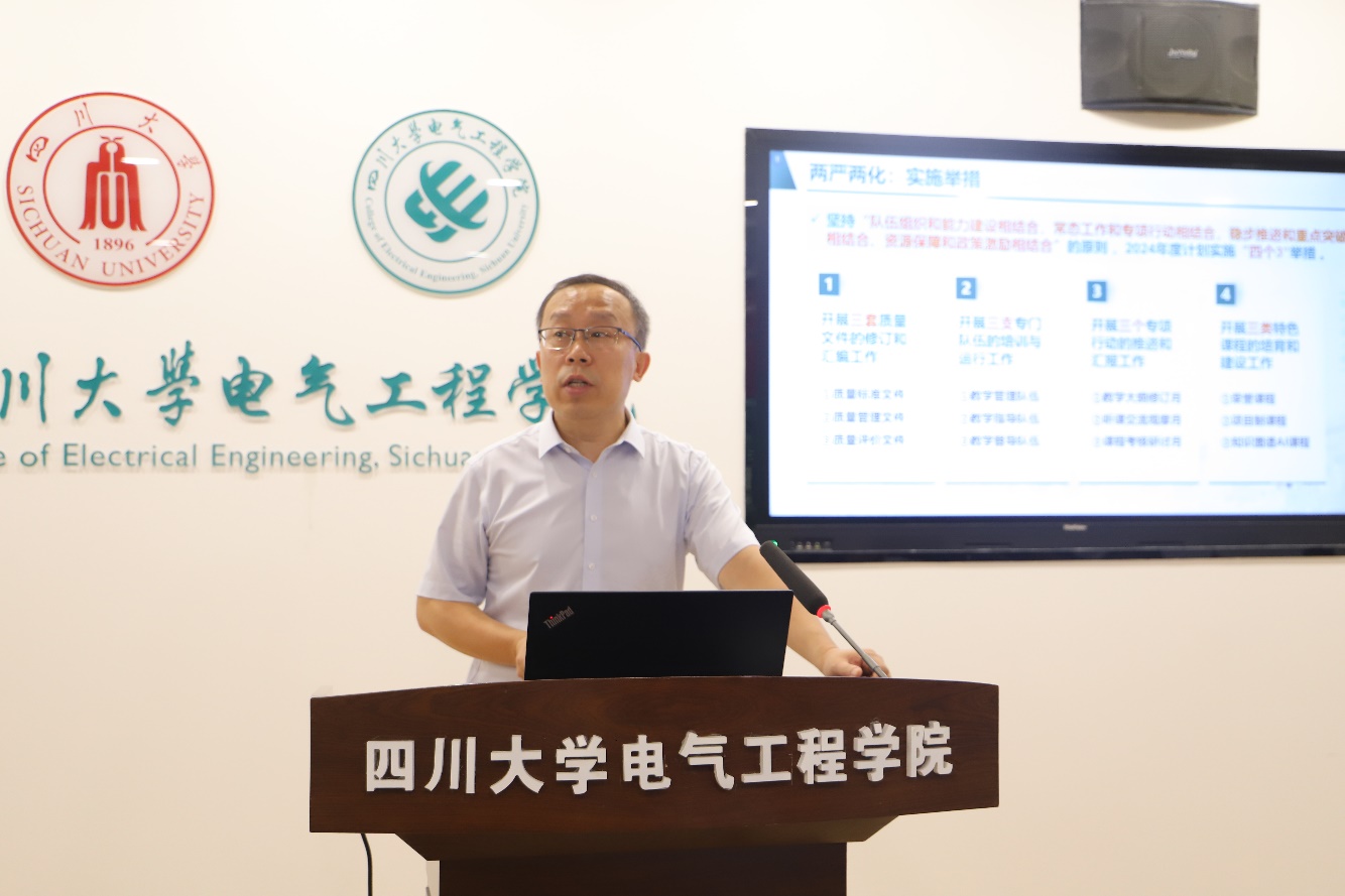 中心工作,要把工作和责任切实落实到每个系、每个部门、每位教职工身上,贯穿到人才培养各环节;每位教职工都要明确责任主体身份,以高度责任感在所涉及的工作环节中,把牢质量关、作出好成绩;要在已有工作的基础上,进一步完善人才培养机制,全面推进教育教学提质升级,履行好一流大学的初心使命,为党育人、为国育才;要聚焦上一轮审核评估、专业工程认证以及新阶段一流人才培养中的关键核心问题,理清思路,明确目标,梳理逻辑,找准方法,结合学科发展和国家发展重大需求,以本次审核评估为契机,抓住发展和提升的历史机遇,奋力推进川大电气整体迈向一流。