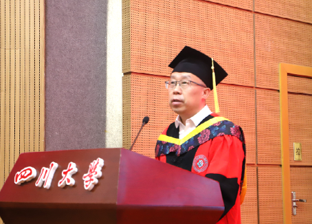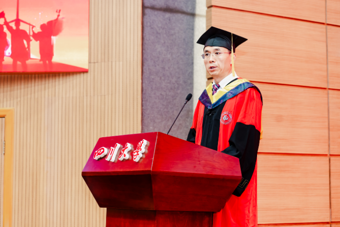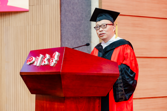 的全体毕业生顺利完成学业、走上新的人生征程表示祝贺。他在致辞中以2025的特殊寓意切入,希望大家始终充满爱党爱国爱川大的真挚情感。他借用学校法学教育创办人邵从恩老先生的名言“内本着良心,上看到国家,下看到百姓”,寄语毕业生要向善而行、向上而行、向人民而行。站在强国建设的关键点上,站在人生发展的转换点上,我们要永远与伟大时代同行,为吃瓜网站