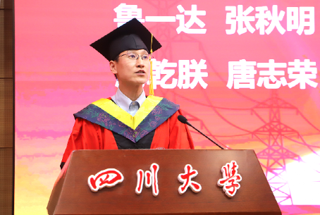 及老师们致以诚挚的感谢与敬意。他讲述了自己从参与到带团队开展“专业+志愿”的实践活动经历,以及受到“时代楷模”国网成都高新连心桥党员服务队感召实现专业与社会责任融合的感悟。他号召毕业生们秉持担当,在能源电力、智能制造领域贡献川大电气学子的力量。