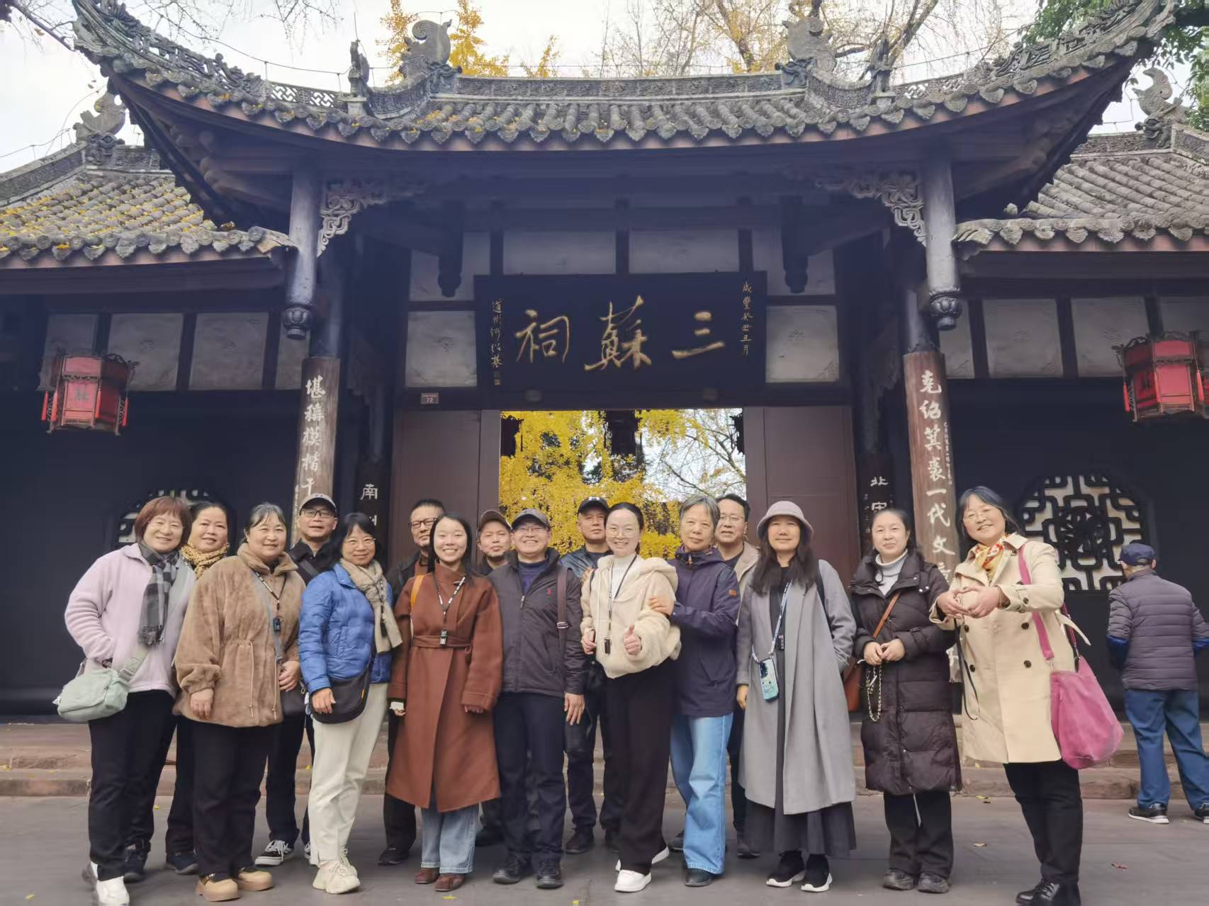 随后,党支部一行前往本次活动的第二站——三苏祠。在专业讲解员的引导下,党员们沿着三苏祠的青砖黛瓦,依次参观了大殿、启贤堂、来凤轩等历史建筑,深入了解了苏洵、苏轼、苏辙的生平事迹、文学成就以及流传千年的家风家训。祠内珍贵的文物、古朴的陈设与厚重的历史氛围,让大家深刻感受到了“一门三词客,千古文章事”的文化底蕴,也对三苏父子在文学创作与为人处世中所秉持的精神品格有了更为深刻的理解。