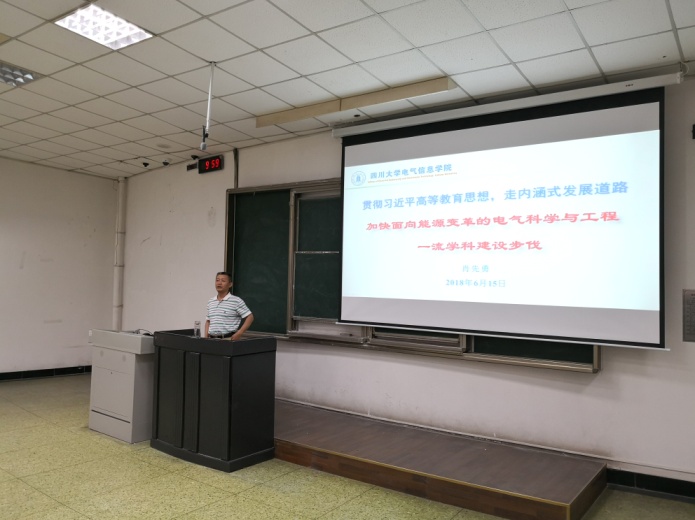 院长肖先勇教授走进2015级本科生的形势与政策课堂,为同学们讲授以“加快面向能源变革的电气科学与工程一流学科建设步伐”的专题思想政治理论课。辅导员于孜清老师以及全体2015级本科生参加了此次课程。