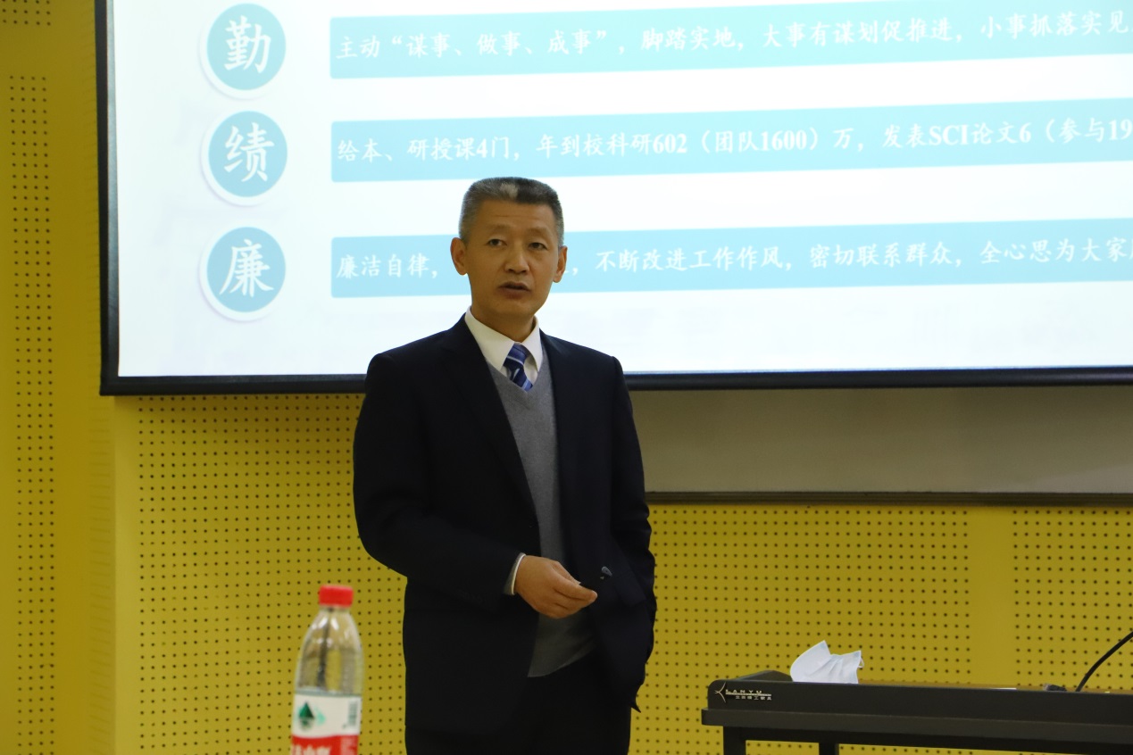 韩芳同志首先代表学院党委做2020年度学院党委工作报告及年度岗位述职。韩书记从学院党委“‘把方向、管大局、保落实’作用发挥”、“师德师风建设效果”、“推进‘三全育人’,打造思政育人新格局”、“支部标准化规范化建设,党支部凝聚力和战斗力提升”、“围绕中心工作做好宣传策划”、“全面从严治党、党委主体责任和纪委监督责任充分发挥”、“疫情防控和扶贫工作开展”、“做好群团、统战和离退休等工作,营造良好发展氛围”等七方面总结了一年来学院党委在疫情防控期带领全院师生在党建和事业发展中所取得成绩,感谢全院师生对学院工作的辛勤付出,希望在接下来的一年里党政齐心,全院师生共同努力,力争学院党建和事业发展得更好成绩。