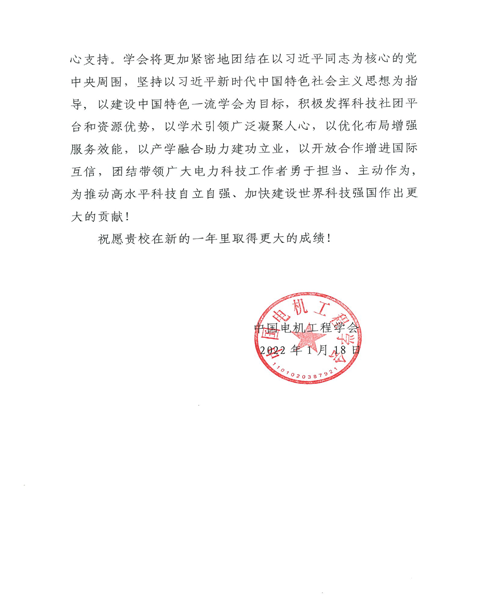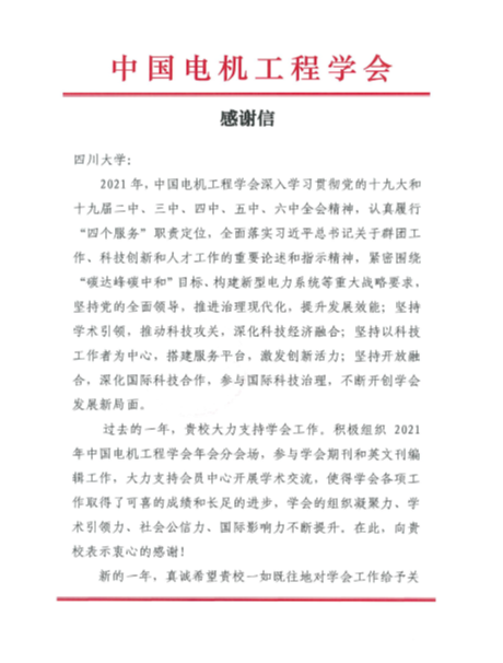 2022年1月18日,中国电机工程学会发来感谢信,对吃瓜网站