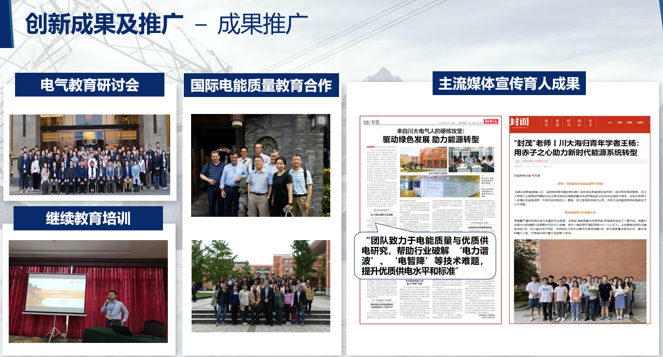 课程建设成效显著,课程获四川省线下一流本科课程、校级课程思政榜样课程、校级“探究式-小班化”教学质量优秀奖、校级课程思政榜样课程;课程组事迹获得华西都市报、封面新闻等主流媒体报道,教学育人模式在社会面得到有力宣传;多位学生毕业后继续奋斗在电能质量科研和工程前线。我们将不断探索和改进课程建设新模式,为我国从工程教育大国向工程教育强国的转变贡献电气力量。