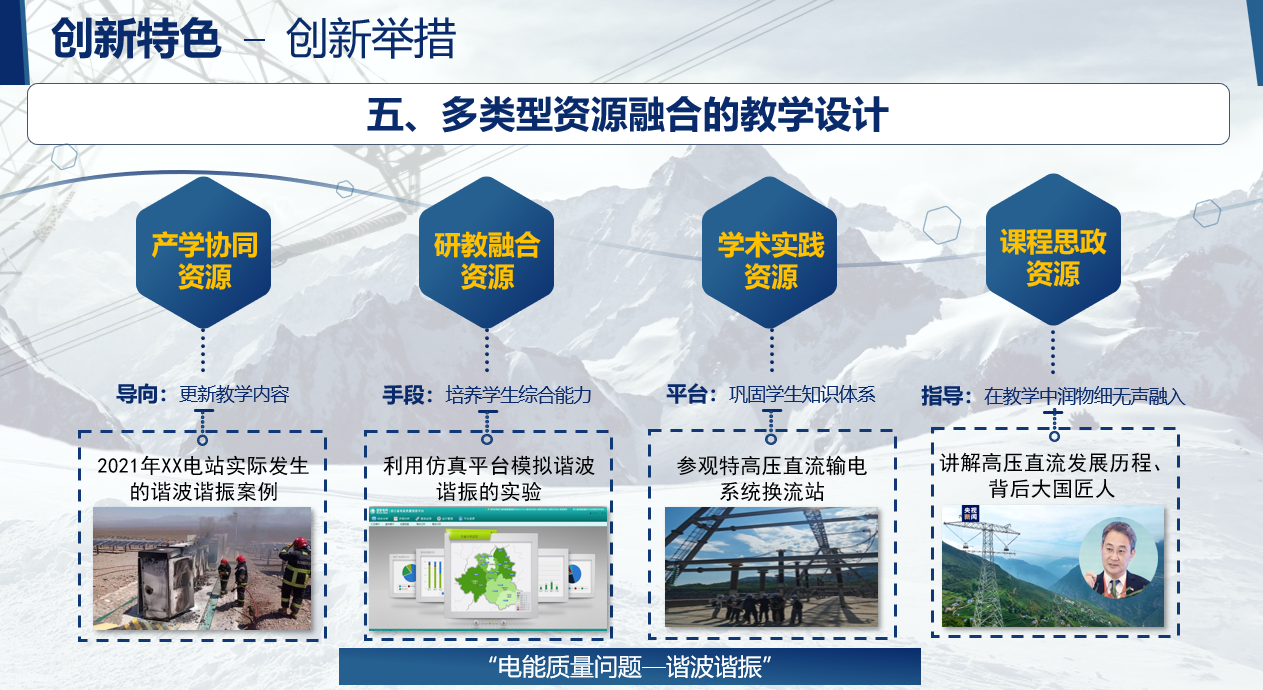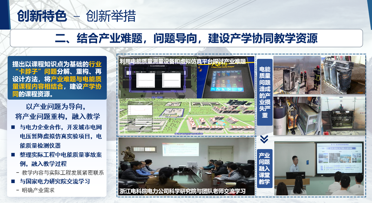 本课程存在教学内容与学科发展脱节、理论教学与工程实践结合困难、课程思政教育薄弱的痛点问题。鉴于此,课程组构建了产学协同、研教融合的教学模式:1)为响应“双碳”发展目标,将新能源、储能等新技术及相关电能质量问题引入课堂,以产学协同的教学模式对产业难题进行重构和再设计;2)采用调研、仿真、样机研制等形式将课程内容落到实处,以研教融合的教学模式培育学生们解决实际工程问题的能力;3)深入挖掘电气学科作出突出历史贡献的“大国匠人”以及他们所创造的“大国重器”,培育具有崇高理想信念、扎实专业知识、强烈创新意识和宽广国际视野的国家栋梁和电力行业精英。