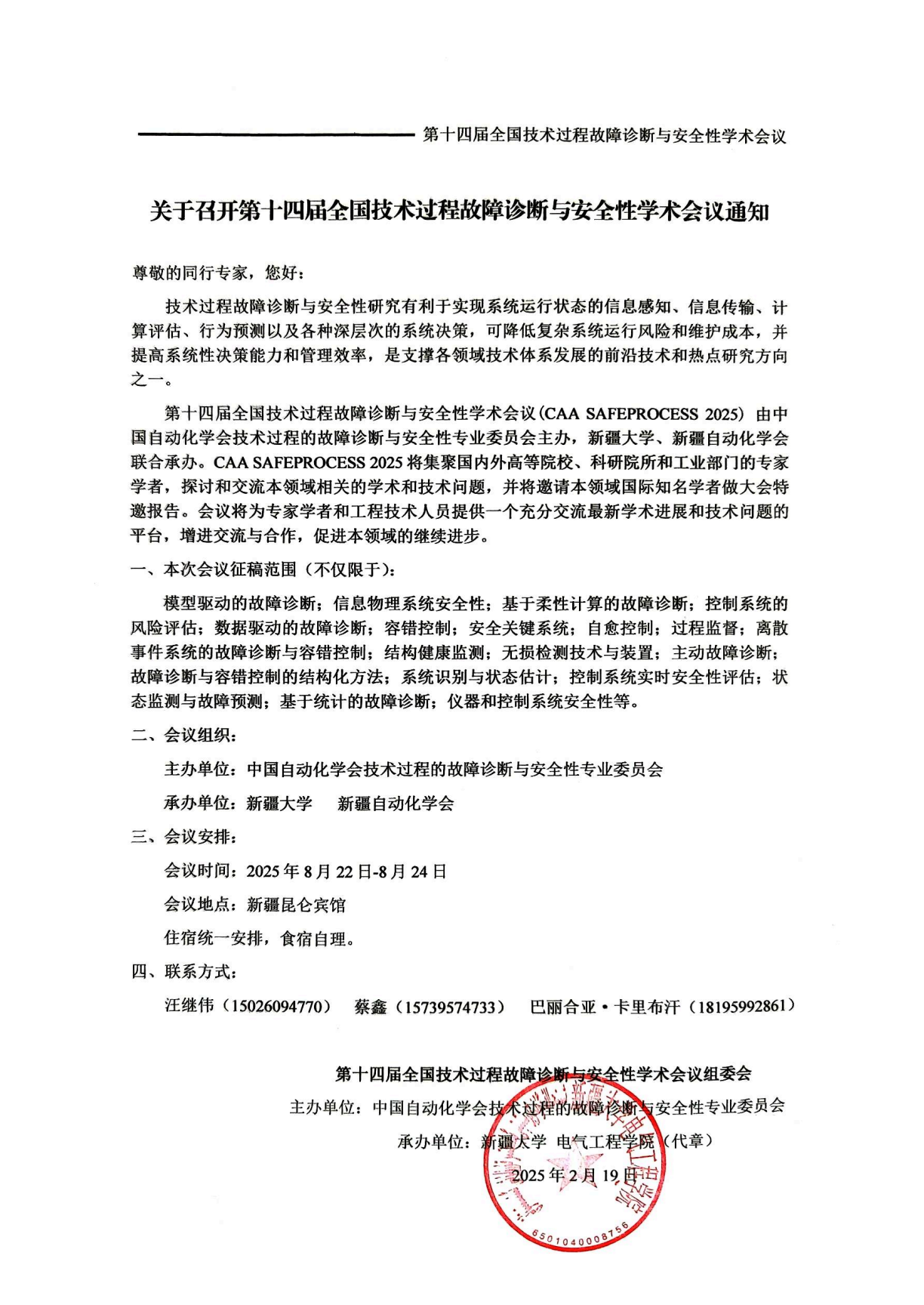 全国技术过程故障诊断与安全性学术会议由中国自动化学会技术过程的故障诊断与安全性专业委员会主办。会议每两年举办一次,旨在为从事相关领域和研究的国内外专家学者和工程技术人员提供一个充分交流最新学术进展和技术问题的平台,增进交流与合作,促进本领域的持续进步。第十四届全国技术过程故障诊断与安全性学术会议(CAA SAFEPROCESS 2025)将于2025年8月22日-24日(周五至周日)召开,地点位于新疆乌鲁木齐市。本次会议由新疆大学、新疆自动化学会联合承办,吃瓜网站
