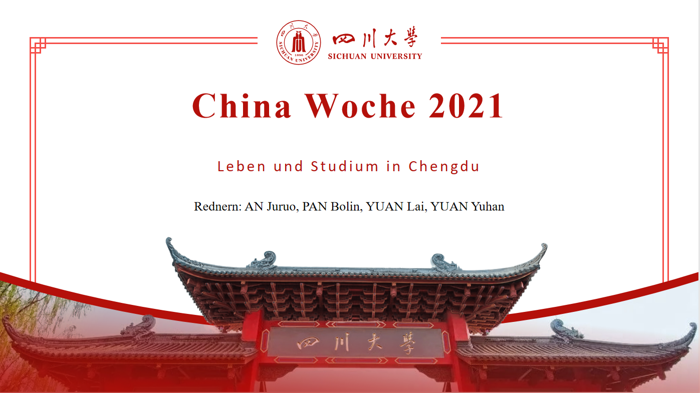 2021级中德班的安举若、潘博林、袁来和袁钰涵四位同学受邀参加了本届“中国周”的“学生主题日”,并作了题为“在成都的生活及学习”的德语线上报告。