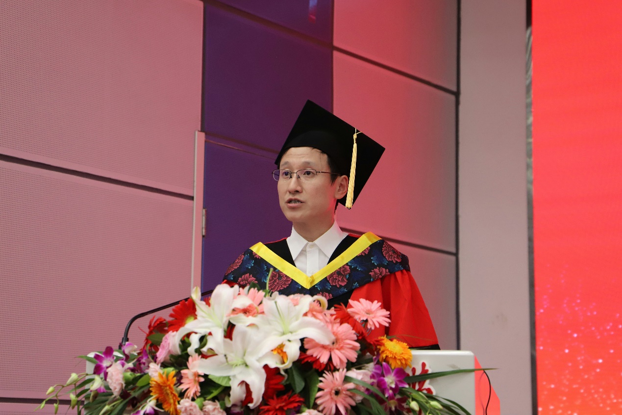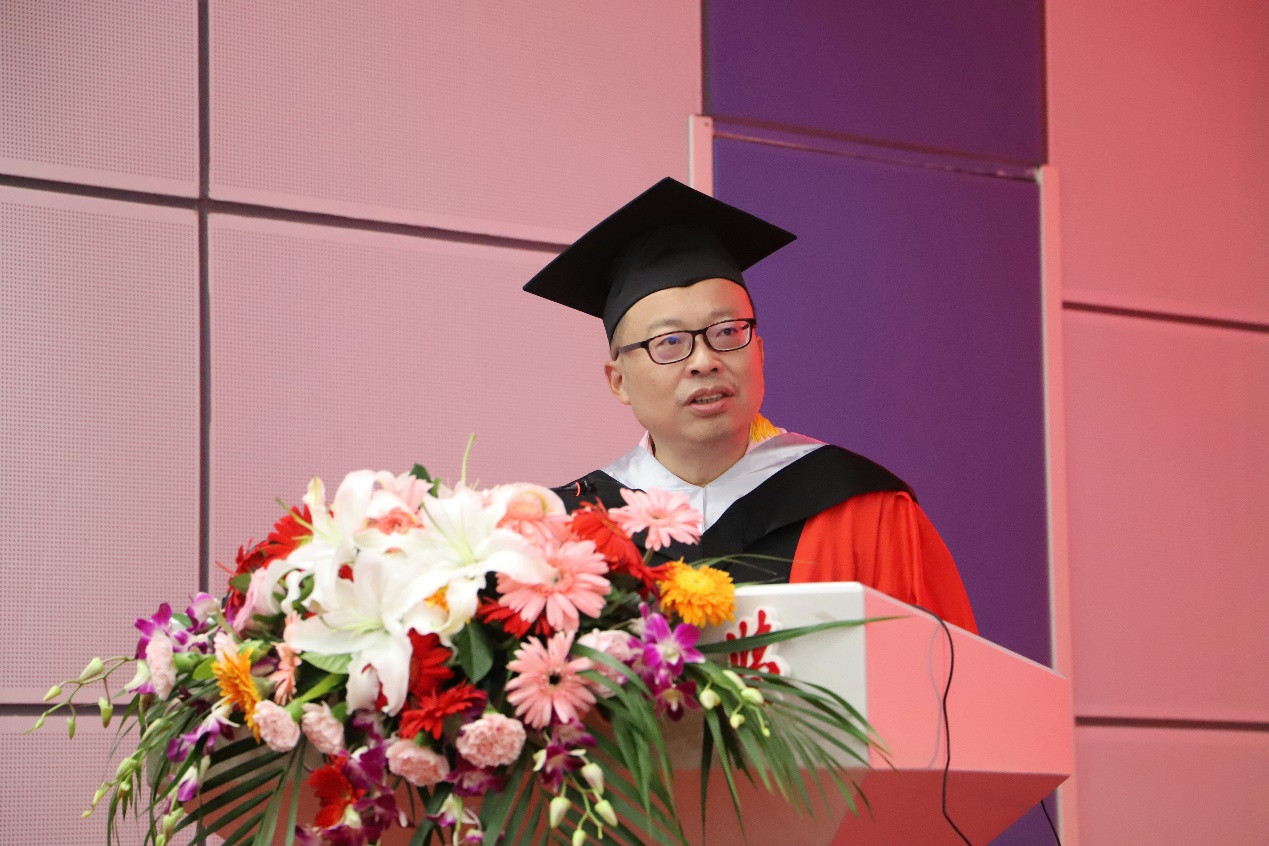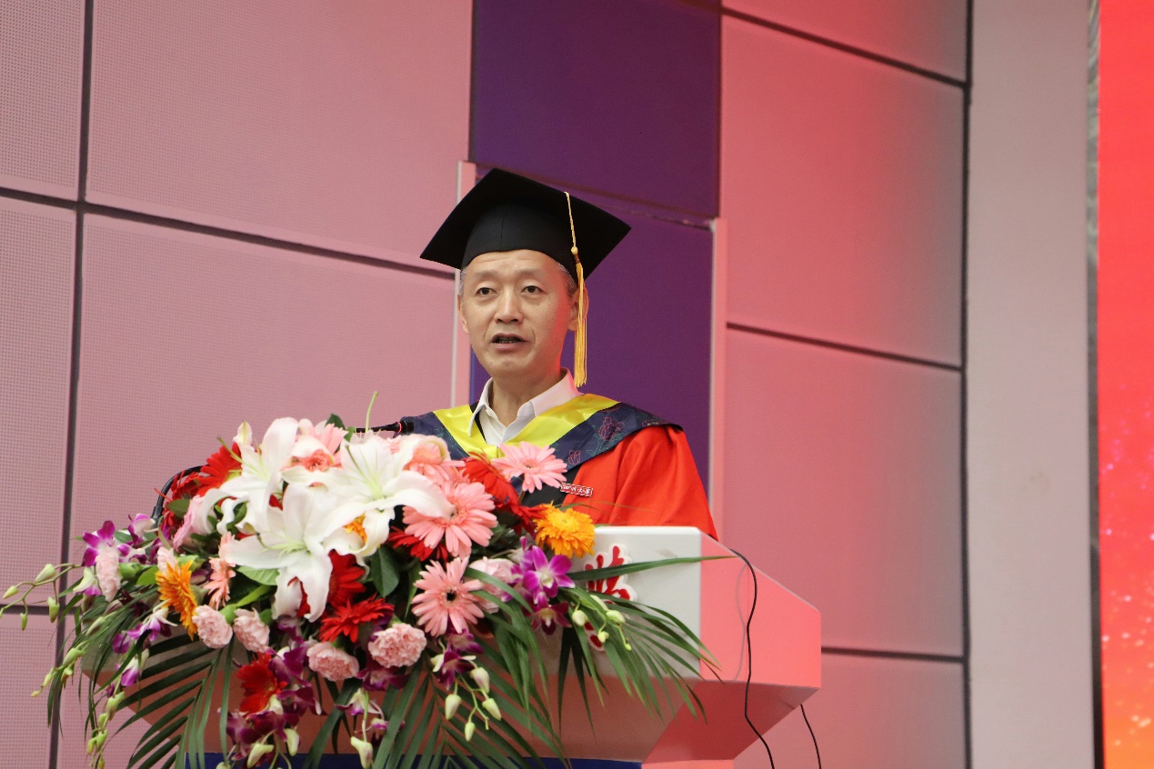 的全体毕业生顺利完成学业、走上新的人生征程表示祝贺,同时也为同学们送上了三句毕业赠言。一是“眼中有光亮,人生有希望”,希望同学们看到世界的美好,感悟人生的美好,在惊涛骇浪中起立,在狂风暴雨中前行;二是“眼中有他人,肩上有重任”,希望同学们勇敢地做最好的自己,与时代一起成长,被他人热情接纳,被社会开怀拥抱;三是“眼中有社会,手中有玫瑰”,希望同学们发现一个个机遇,回答新时代挑战,把美好献给社会,修炼走进社会的道路。