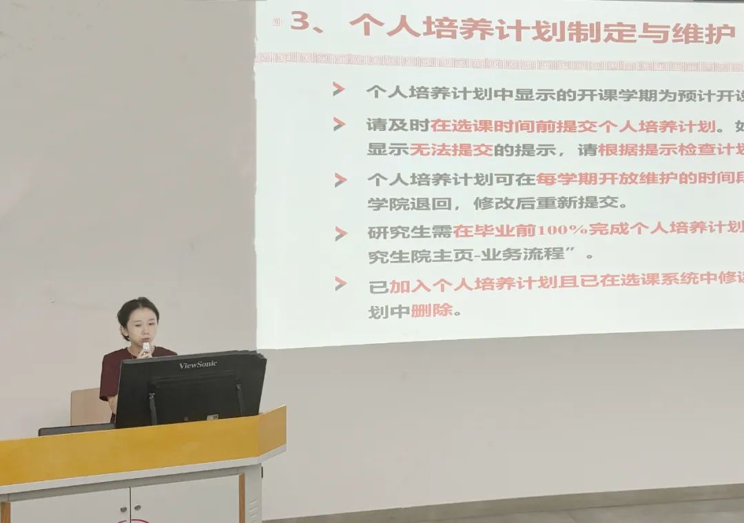 9月12日下午,吃瓜网站 研究生科何佳蔚老师作研究生培养方案讲解,具体针对研究生新生的个人培养计划制定与维护、选课安排以及培养方案解读进行了详细阐述。何佳蔚老师表示,个人培养计划是研究生阶段的重要指南,要求每位新生结合自身的学术兴趣和未来发展方向,与导师充分沟通,合理规划课程学习与科研任务。同时,对课程选修的流程与注意事项作了具体说明,帮助新生们更好地了解和把握学习进程,为未来的学术生涯打下坚实基础。