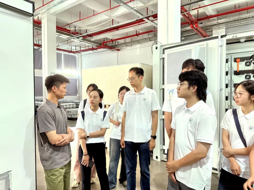 当天下午,实践团驱车前往质点能源位于江门的生产基地。在产品总监薛国威的带领下,师生们参观了现代化生产线,详细了解了产品从原材料加工、核心部件组装到最终检测的全流程质量控制体系。特别是在储能电池组装车间,学生们就工艺细节与技术人员进行了专业探讨,将课堂所学与工业实践进行了深度对接。