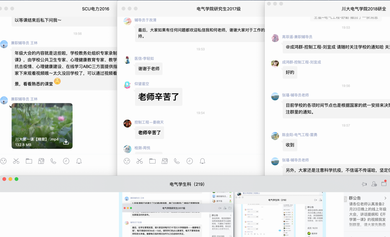本次年级大会,各专兼职辅导员采用了文字传达、语音与视频直播等多样化的线上模式。虽然相隔千里,但仍阻挡不了师生间亲密的交流与互动;本次年级大会重点强调了以下三方面内容。第一,要进一步统一思想,增强战胜疫情的信心。作为青年大学生,在疫情面前,要保持理性,做好疫情防控,保护好自己;同时要坚定信心,不传谣不信谣,相信在党和国家的领导下,在全国14亿人的共同努力下,我们定会夺取抗击疫情的最终胜利。第二,要尽快适应线上教学,从思想和行动上做好开学准备。新的线上教学模式要求大家提高自觉性和适应能力,积极与老师配合,有问题也要及时与老师沟通;虽然身处校外,但学习丝毫也不能松懈。第三,要严格遵守学校的相关规定,尤其不得提前返校。