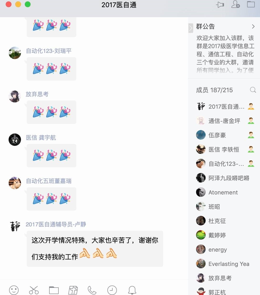 本次年级大会,各专兼职辅导员采用了文字传达、语音与视频直播等多样化的线上模式。虽然相隔千里,但仍阻挡不了师生间亲密的交流与互动;本次年级大会重点强调了以下三方面内容。第一,要进一步统一思想,增强战胜疫情的信心。作为青年大学生,在疫情面前,要保持理性,做好疫情防控,保护好自己;同时要坚定信心,不传谣不信谣,相信在党和国家的领导下,在全国14亿人的共同努力下,我们定会夺取抗击疫情的最终胜利。第二,要尽快适应线上教学,从思想和行动上做好开学准备。新的线上教学模式要求大家提高自觉性和适应能力,积极与老师配合,有问题也要及时与老师沟通;虽然身处校外,但学习丝毫也不能松懈。第三,要严格遵守学校的相关规定,尤其不得提前返校。