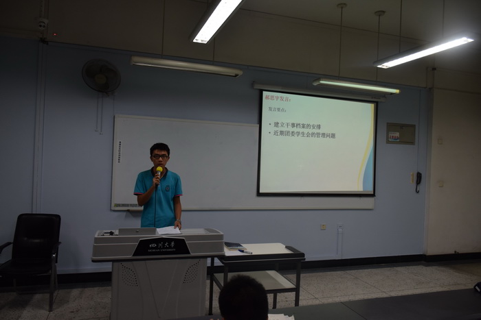 院团委学生会各执行副主席依次上台发言,按自己的工作重心提出建设性意见。执行副主席白健就活动推送、礼仪、新闻工作及海报审核等方面做了详细介绍,执行副主席朱愉田申明了报账、开发票流程及注意事项,执行副主席黄瑞杰围绕怎样带好干事做了几点指导,执行副主席郎喜文就工作态度问题与在座者展开探讨。执行学生团委副书记郝思宇同学针对建立干事档案和近期学生会的管理问题作出妥善安排。