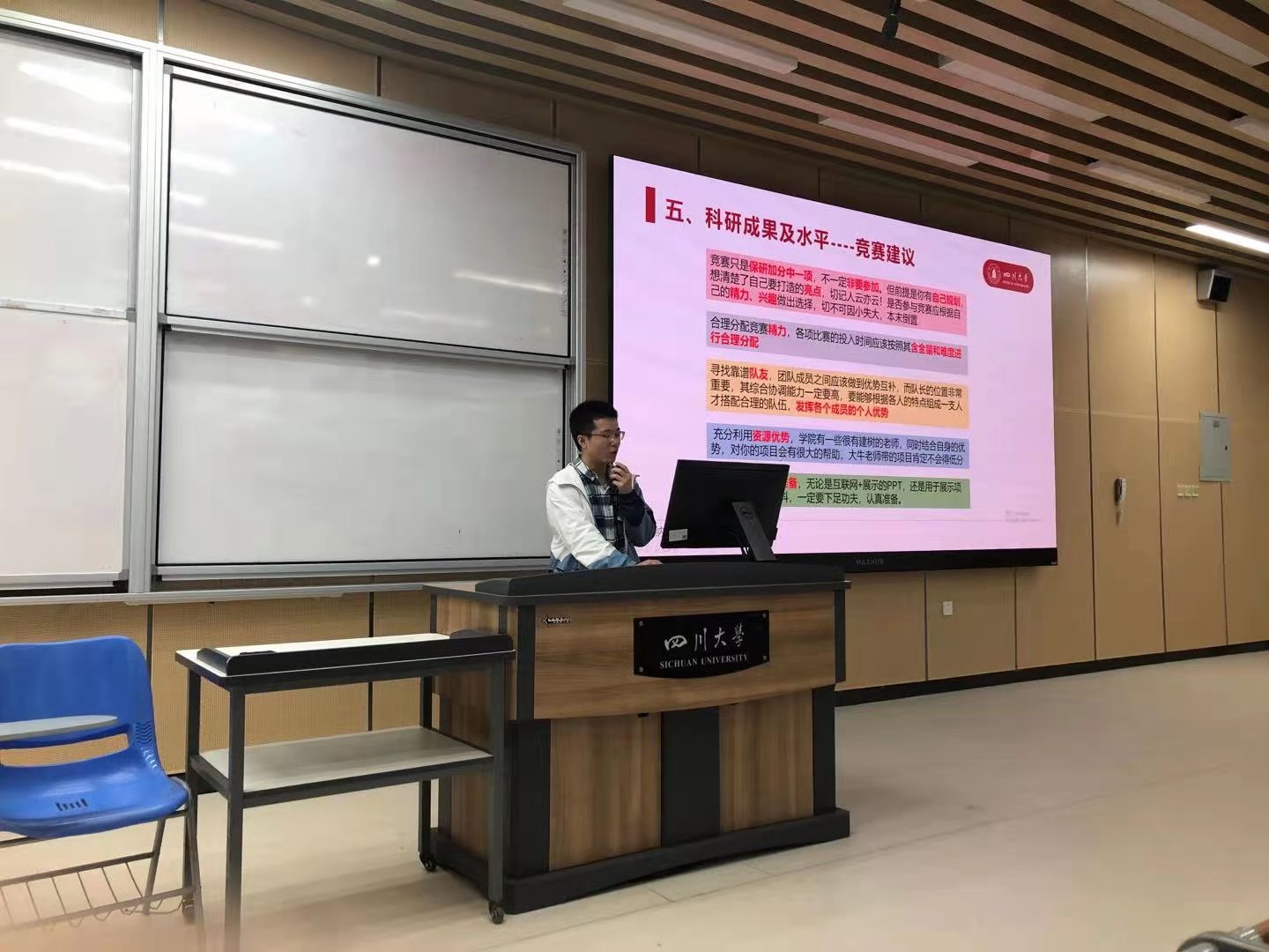 部分科研团队的概况作了介绍。伍彦豪结合自己在川大的求学经历,对深造选择问题进行了分享,并建议低年级同学们要早定目标、早做准备。已获得境外高校offer的边彤,则着重从出国准备、国家选择、学校申请等具体方面展开分享,为立志出国深造的学弟学妹们提出了不少中肯建议。每场交流会结束后,学长学姐都耐心对同学们的提问进行解答,现场气氛积极踊跃。