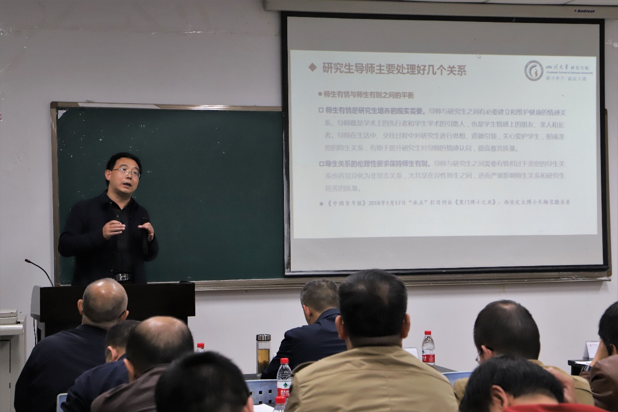 党委副书记张英敏的主持下,由李栓久教授首先为与会研究生导师们作报告。李栓久教授结合自身经历,围绕研究生人才培育,总结出对研究生导师的要求及研究生培养机制的构建方法。他说,研究生导师应明确“立德树人”的职责定位,牢记导师基础工作的“8个一”,平衡好导师对学生的影响和管束、师生之间的情谊和尊重、专业能力培养及综合素质提升之间的关系。并提出,导师与辅导员必须构建好协同育人机制,发挥双方优势,夯实课题组建设,构建以课题组及科研团队为基本单位、研究生导师主导的研究生培养机制。