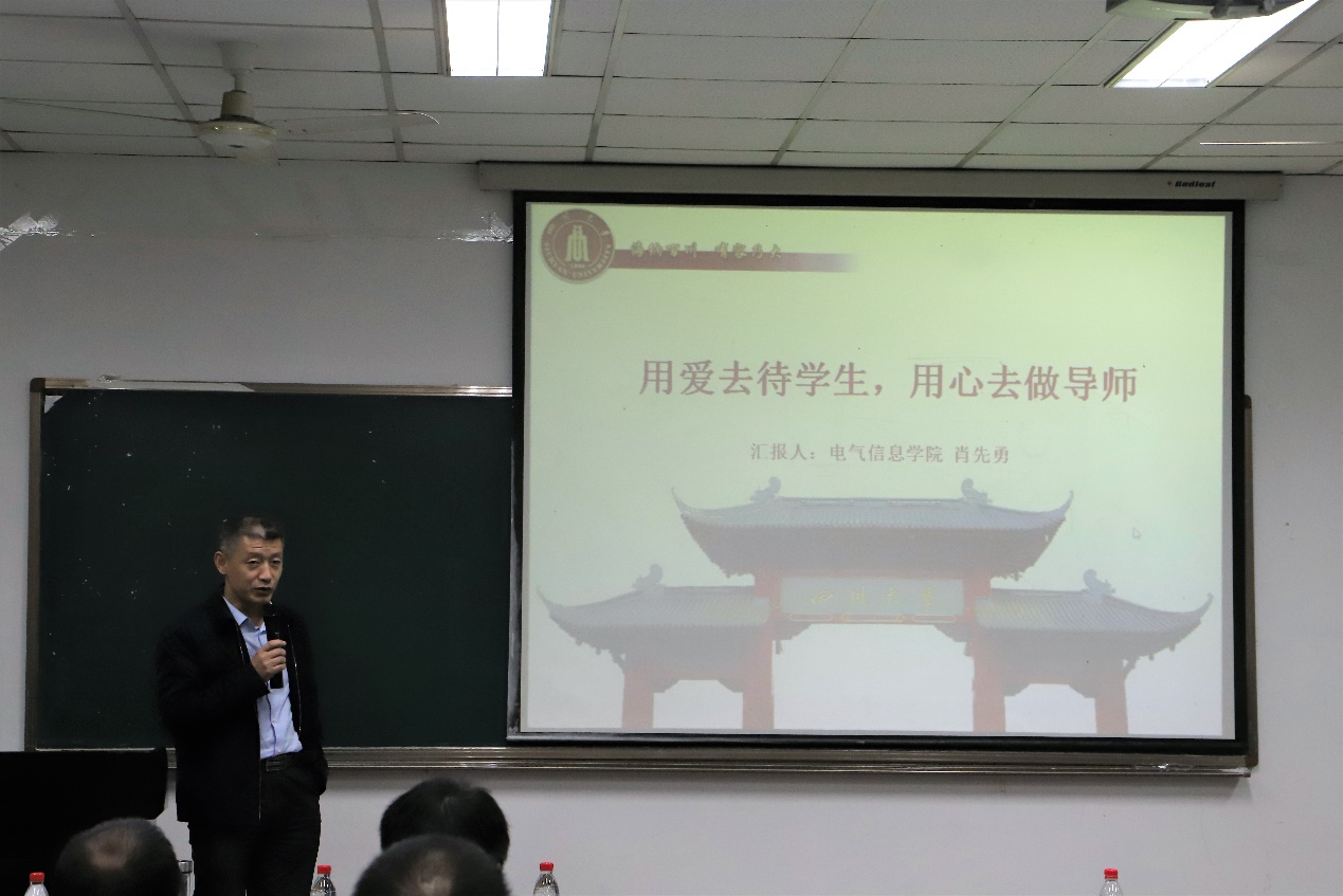 肖先勇院长进行发言。他强调,研究生导师是造化人才的灵魂工程师,自己十分重视“研究生导师”这一身份,时刻提醒自己要以身作则、言传身教。肖院长提出,研究生导师作为引领本科生跨越至学者的关键人物,应当全方位帮助研究生提升各方面的能力,注重细节把控、强调规范,并将规范融入到日常学习工作的方方面面。他希望研究生导师们应具备“坚持”和“真心”,做到发自内心地关爱学生,对待学生既要严格也要慈爱,最大程度引导、激发学生的潜能。