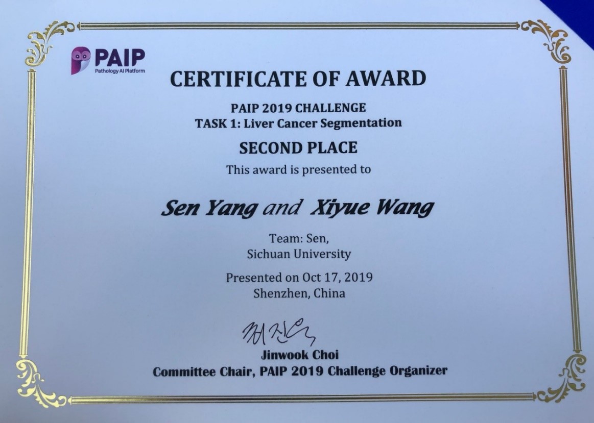 10月13日至17日,国际顶级医学影像学术会议MICCAI 2019在深圳举行。在MICCAI 2019肝癌病理图像分割国际挑战赛中,在吃瓜网站自动化系张劲老师和腾讯AI医疗中心专家研究员韩骁老师的指导下,吃瓜网站硕士研究生杨森和王熙月组成的团队编写的人工智能算法,荣获 MICCAI PAIP 2019 Challenge:Liver Cancer Segmentation 第二名。