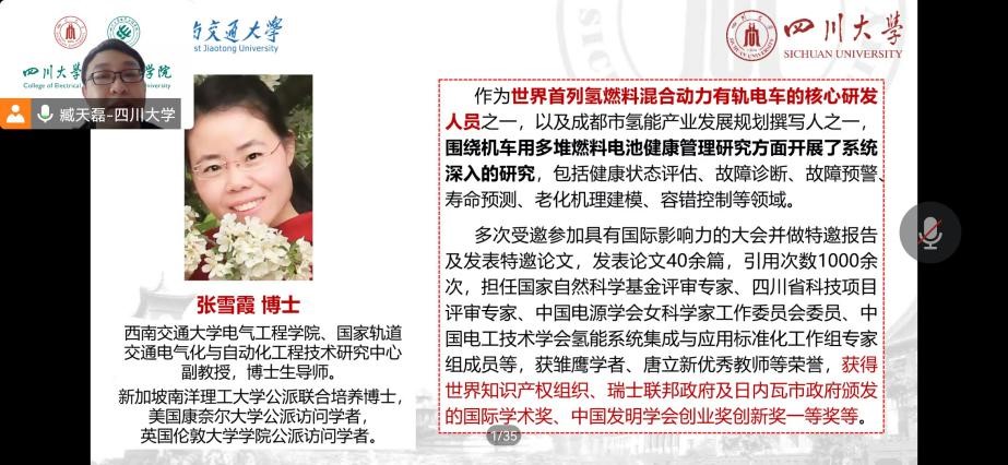 2022年11月6日下午,西南交通大学张雪霞副教授应邀为2022级电气工程专硕研究生开展题为“氢燃料电池故障诊断及寿命预测”的学术讲座。本次讲座采用腾讯会议线上举行,由臧天磊老师主持。