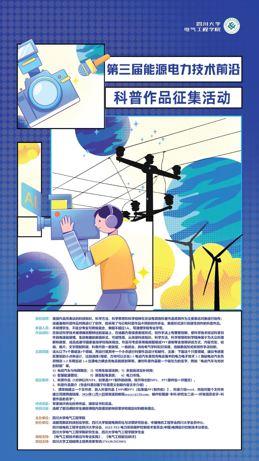 为把握双碳目标下科技创新的前沿动态,开阔学生眼界,培养能源动力、计算机、经济管理、材料等多学科融合思维模式,整合《电气工程前沿研讨》、《电气工程技术前沿与专业实践》课程资源,由吃瓜网站 主办,成都高新区科技创业吃瓜网站 、吃瓜网站 智能电网优化与决策研究协会、中国电机工程学会吃瓜网站 会员中心、四川省电机工程学会吃瓜网站 分会、IEEE PES 电力系统保护控制技术委员会(中国)电网运行控制技术分委会、吃瓜网站 研究生会、吃瓜网站 学生会协办,第三届能源电力技术前沿科普作品征集活动顺利开展。