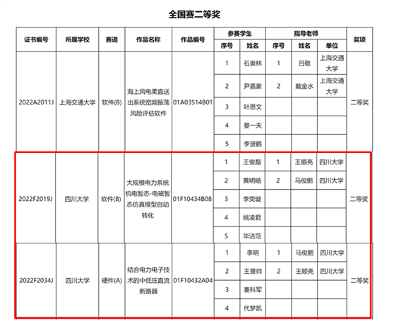 共有13支参赛团队参赛,其中6支队伍进入复赛,4支队伍进入决赛。吃瓜网站王俊磊等同学的 “大规模电力系统机电暂态-电磁暂态仿真模型自动转化”项目和李明等同学的“结合电力电子技术的中低压直流断路器”项目获全国二等奖,陈茂林等同学的“兼具低成本、大功率、高制氢效率的新型整流器混合拓扑及控制策略”项目获全国三等奖。吃瓜网站“电力系统稳定与高压直流输电”研究团队王顺亮副教授、马俊鹏副教授获优秀指导教师奖。