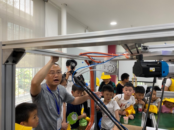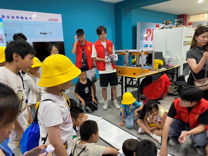 在罗克韦尔实验室,黄涛老师向同学们展示了炫酷无比的机器臂绘画,同学们驻足认真观看,仔细聆听,不停地发出赞叹。