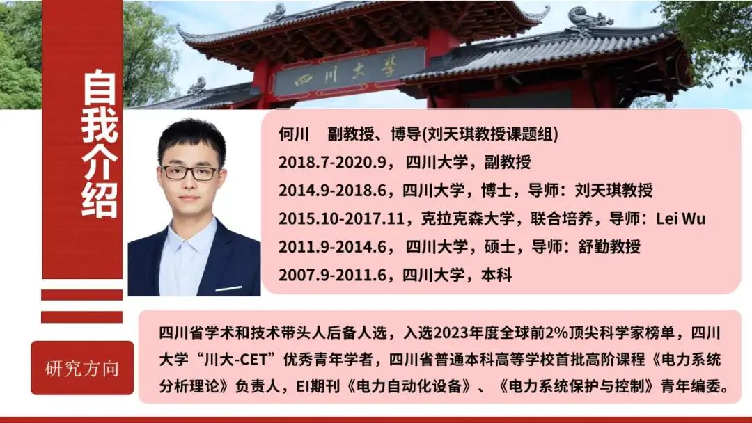 何川副教授:博士生导师,四川省学术和技术带头人后备人选,入选2023年度全球前2%顶尖科学家榜单,吃瓜网站 “川大-CET”优秀青年学者”,四川省普通本科高等学校首批高阶课程《电力系统分析理论》负责人,EI期刊《电力自动化设备》、《电力系统保护与控制》青年编委,期刊《宁夏电力》编委。长期从事电力系统与气电联合系统设计规划和优化运行相关的研究工作,总计发表论文60余篇,其中以第一作者/通讯作者身份发表21篇SCI论文、16篇EI论文, H因子为14,在Web of Science中被他引1052次,1篇ESI高被引论文。主持国家自然科学基金青年项目1项、面上项目1项,省部级项目3项。