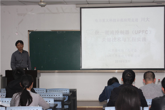 2018年3月29日下午14:00国网江苏电力公司电力科学研究院副院长李群博士应邀在电气信息吃瓜网站 基础教学楼B104教室举行了“统一潮流控制器(UPFC)关键技术与工程实践”学术讲座。电气信息吃瓜网站 院长肖先勇、电气工程系主任王渝红教授以及相关专业老师、博硕研究生参与此次讲座。