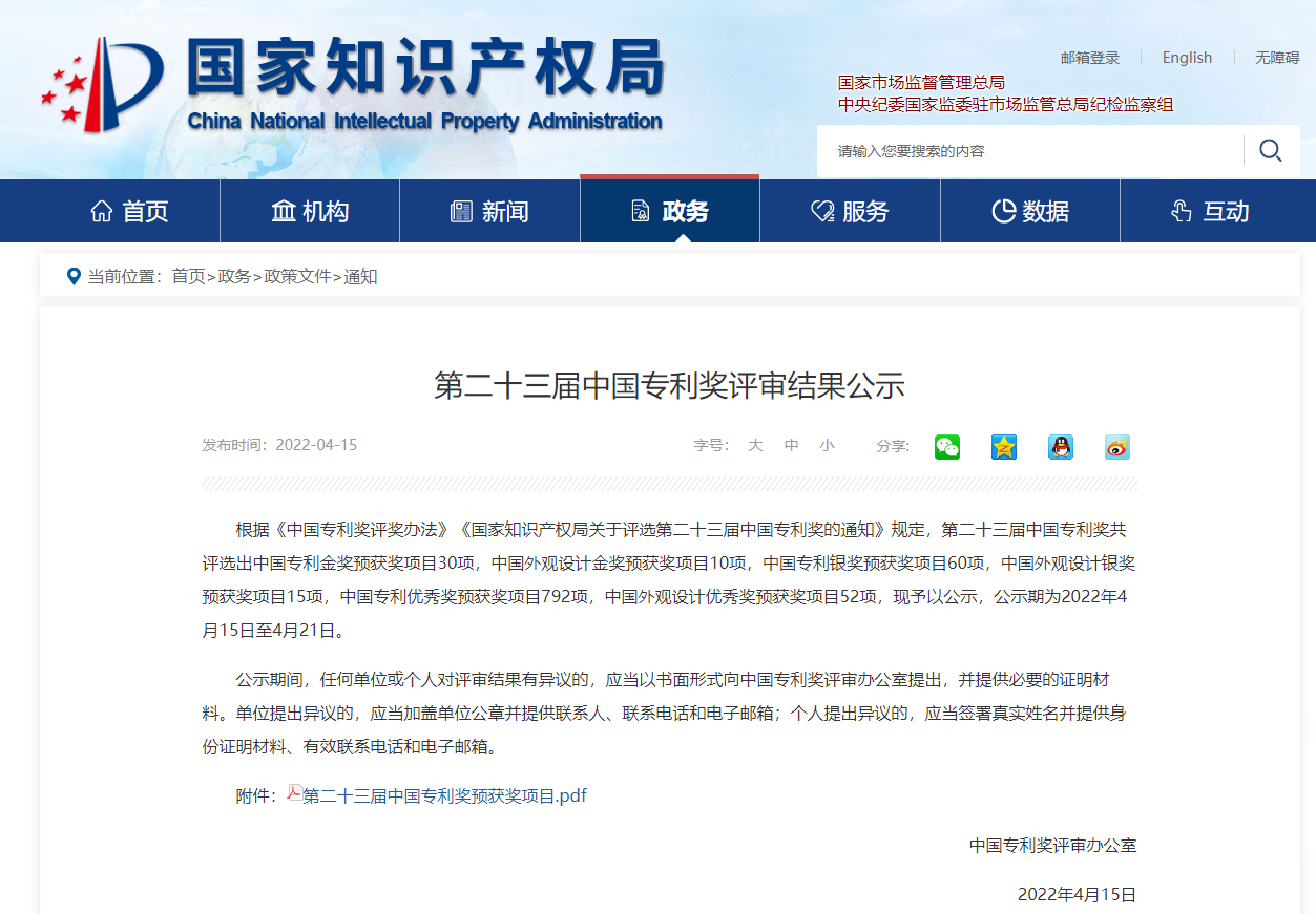 2022年4月15日,国家知识产权局公示了中国专利奖评审结果,吃瓜网站