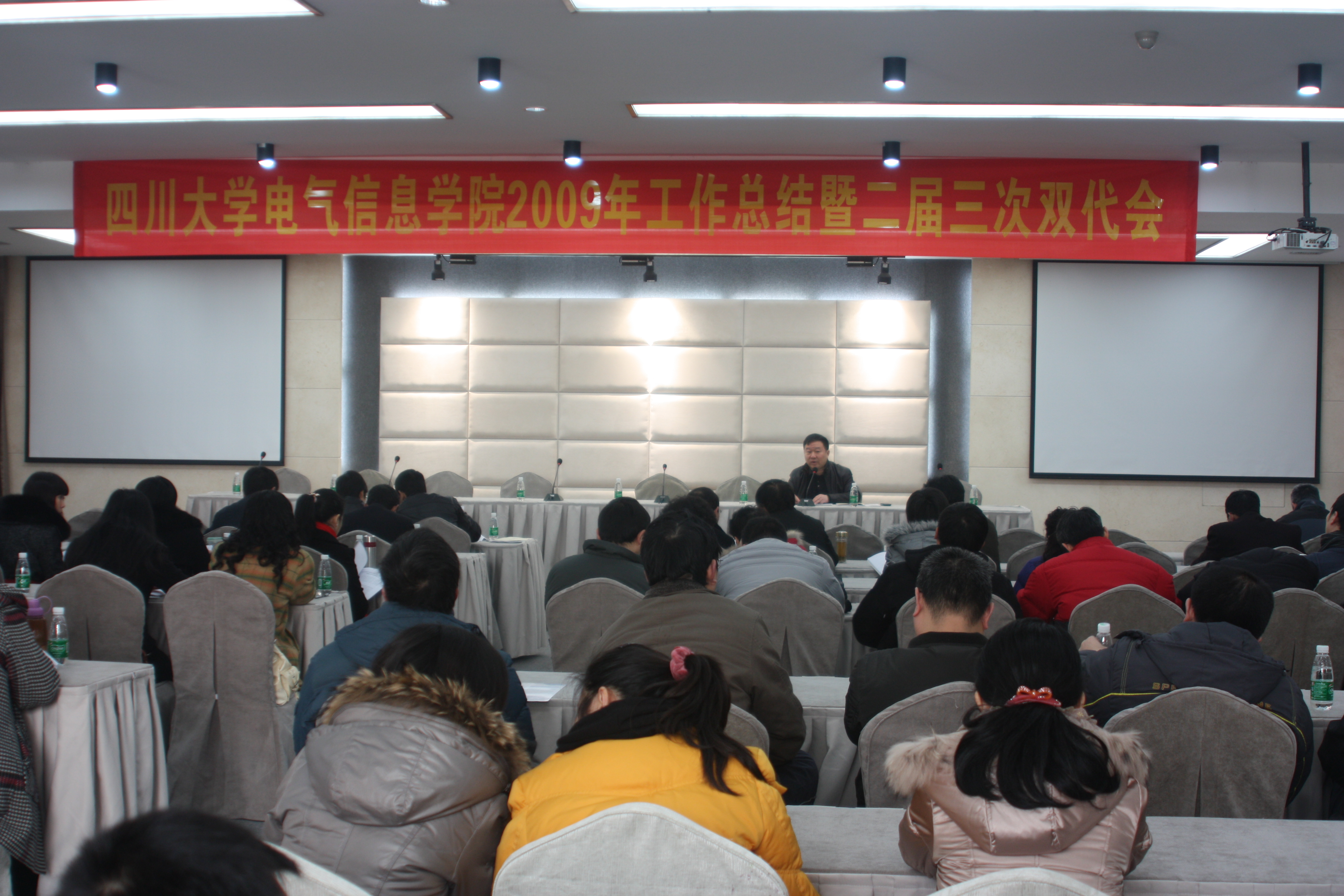 1月27日上午10时,电气信息吃瓜网站 2009年工作总结会暨二届三次双代会在华阳南湖会议中心召开。全体教职工参加了会议,吃瓜网站 副校长赵昌文教授出席了这次会议。会议由电气信息吃瓜网站 党委副书记邱晓燕教授主持。