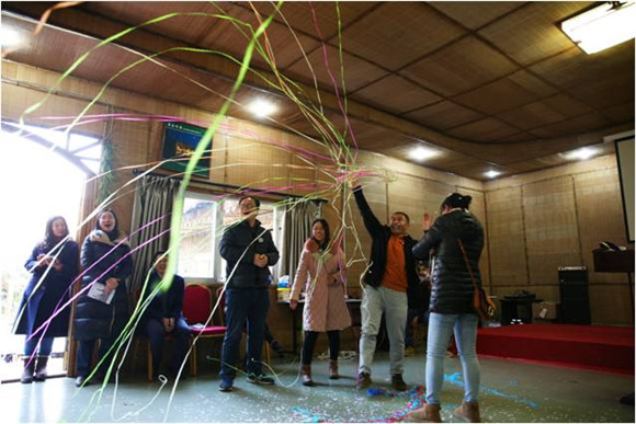 在行政两位年轻老师演唱完歌曲《听,是谁在歌唱》后,文艺活动迎来了第一个活动高潮——抽奖,礼物虽小,欢乐多多。
