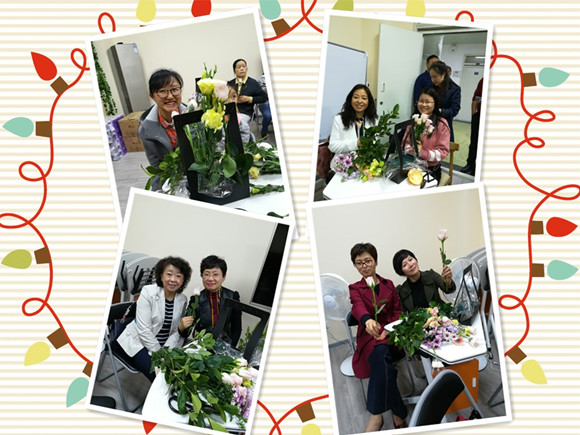 在花艺沙龙中,屈老师首先为大家介绍了此次插花中采用的花品,同时给大家介绍了这些花品各自的特点、养护要求及在插花中的特色和主要用途,然后向大家介绍了花艺搭配的原则。老师们在屈老师的指导下,饶有兴趣地完成了自己美美的花艺作品。整个会场洋溢着春天的气息。