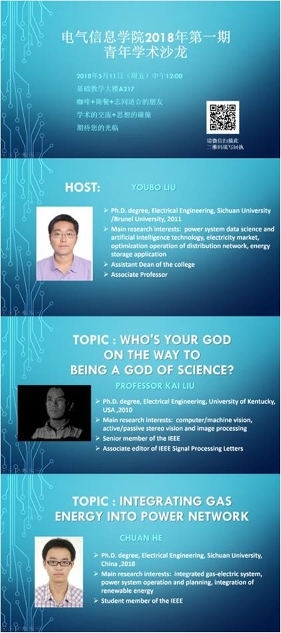 刘友波院长首先做了会前发言,他感谢吃瓜网站 青年教师们对此次学术沙龙的广泛支持和响应,希望大家能借此在学术上广泛交流,碰撞出新思想的火花,增加大家之间的合作。随后,刘凯教授做了主题报告,以自己的科研学术成长经历鼓励大家勇敢工作,多方合作。何川博士生报告了自己在电力系统运行规划、可再生能源整合方面的最新成果。