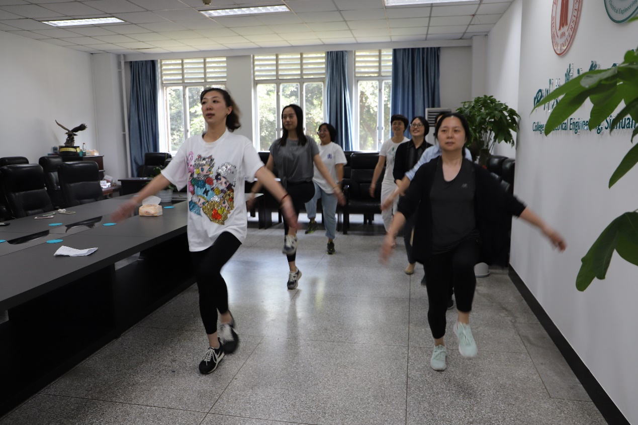 采用腾讯视频会议和雨课堂相结合的方式,精心设立了直播主会场,各单位设立5个运动分会场同步跟播。主播首先在主会场热情满满地向大家介绍了此次活动的规则,为大家展示了准备的丰厚奖品。随后,当主播间运动健身视频音乐响起,各分会场女教师们便跟着律动的音乐运动起来,拉伸、跑跳……一连串有氧运动之后,老师们充分体会了运动带来的畅快之感。三段健身操间隙中,直播间还为老师们组织了抽奖环节,中奖的老师们都无比开心。