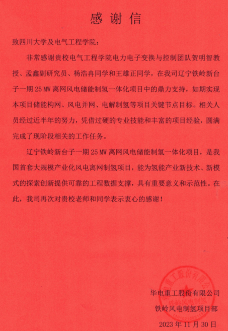 5.,中石油吉林化工工程有限公司,结题。项目成功研发可再生能源电解水制氢系统容量配置软件,该软件已实际应用于中石油吉林化工工程有限公司承接的全球最大体量的绿色氢氨醇一体化项目—中能建松原氢能产业园项目。