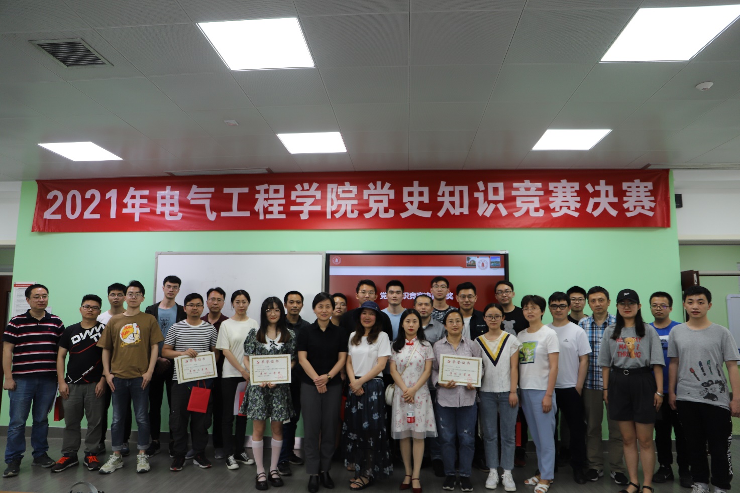 本次竞赛围绕习近平新时代中国特色社会主义思想、中国共产党发展史、新中国史、改革开放史、社会主义发展史等相关知识,设置团队必答题、抢答题、现场互动题等多个环节,抢答题包括线索题、识图题、音频题和视频题等,形式新颖、内容丰富。在必答环节,每支联队分别回答了随机分配的5道题目。参赛选手们准备充分,从容不迫,答题准确,所有题目均回答正确,赢得了满堂喝彩。激烈的竞争发生在抢答环节,选手们聚精会神,仔细聆听,伴随着主持人喊出“抢答开始”的口令,选手们反映敏捷,迅速按下抢答器,答题迅速准确,比分交替上升,紧张刺激的抢答题环节,使现场的气氛十分热烈。经过15道题目的抢答和附加题环节,2019级硕士第一党支部和电工电子中心党支部联队最终取得了全场最高分,获得决赛的集体一等奖,博士研究生党支部和电气信息工程研究与实验中心党支部联队、2020级硕士第一党支部和电气工程系党支部联队获得了二等奖, 2020级硕士第二党支部和自动化系党支部联队、本科生第三党支部和行政党支部联队获得了三等奖。此次决赛充分展示了吃瓜网站