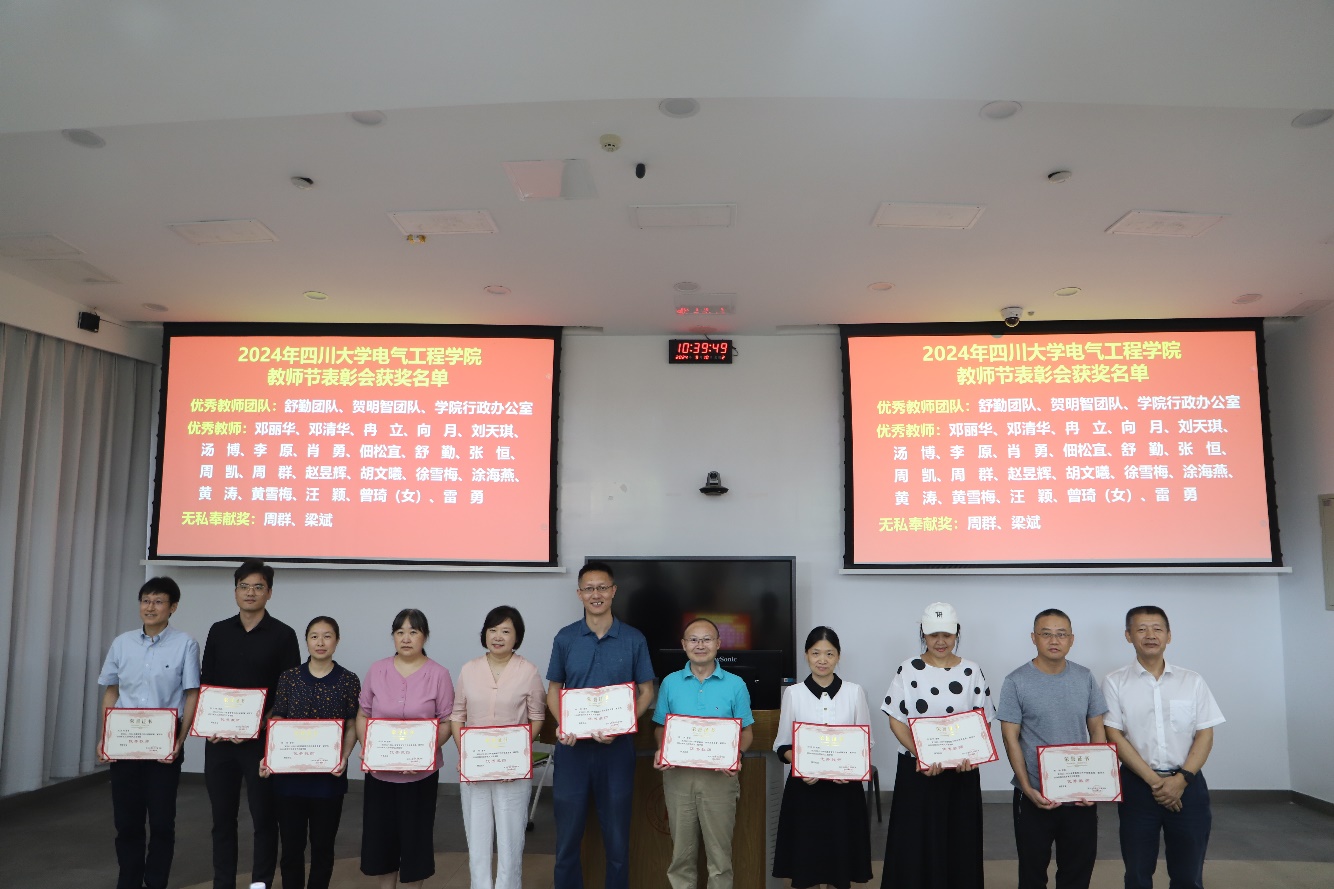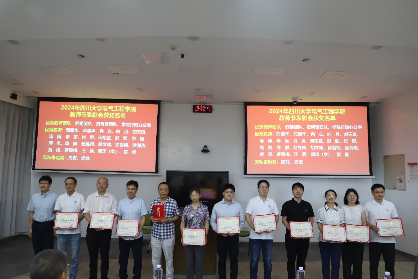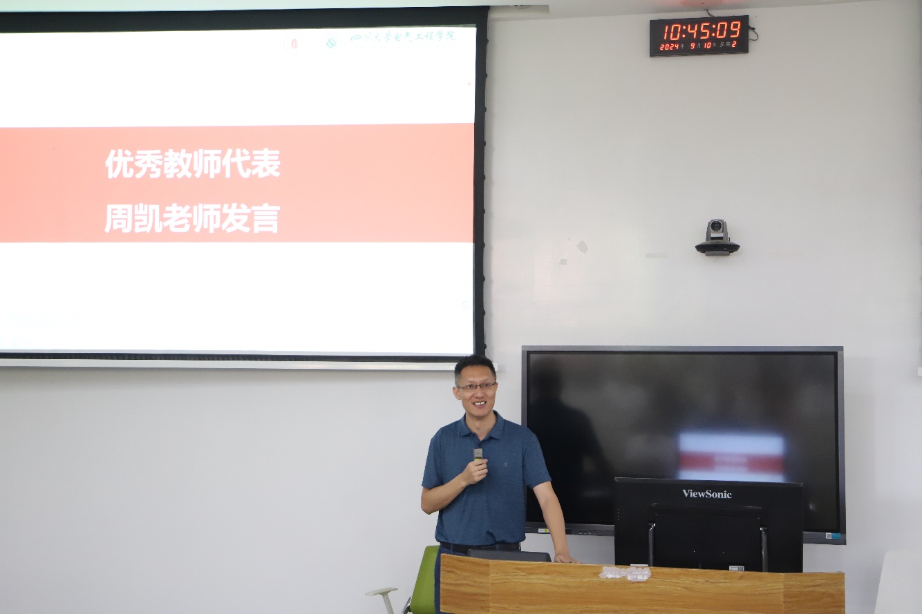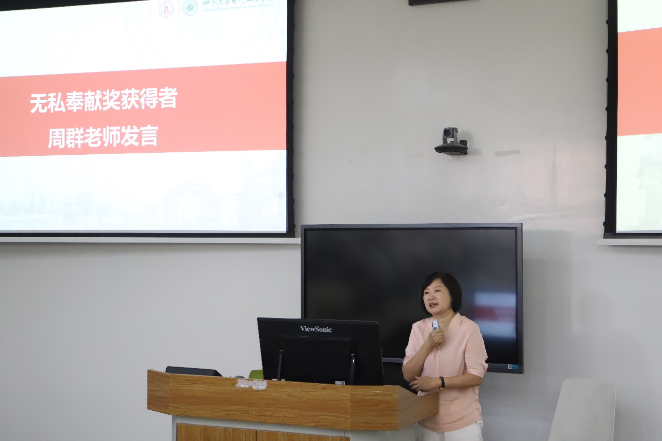 “无私奉献奖”代表周群教授分别作了发言,他们分享了自己对教书育人事业的感悟、热爱与追求,表示将继续传承和弘扬一代代川大电气人的高尚师德风范,潜心教书育人,静心科研创新,肩负起“为党育人、为国育才”的光荣使命。