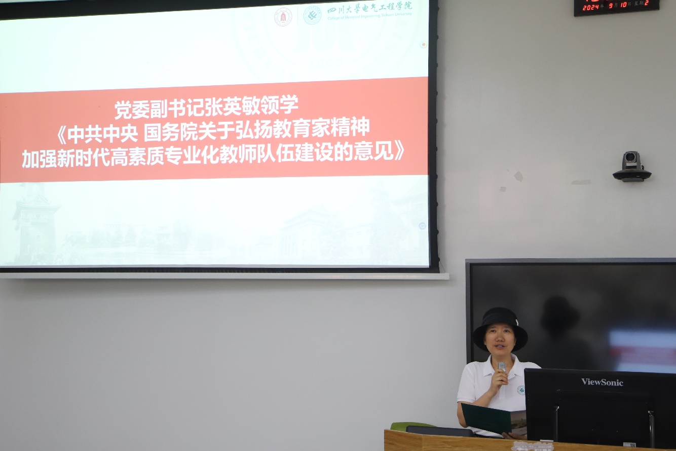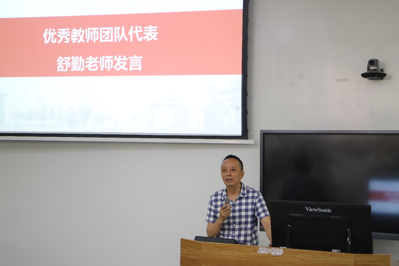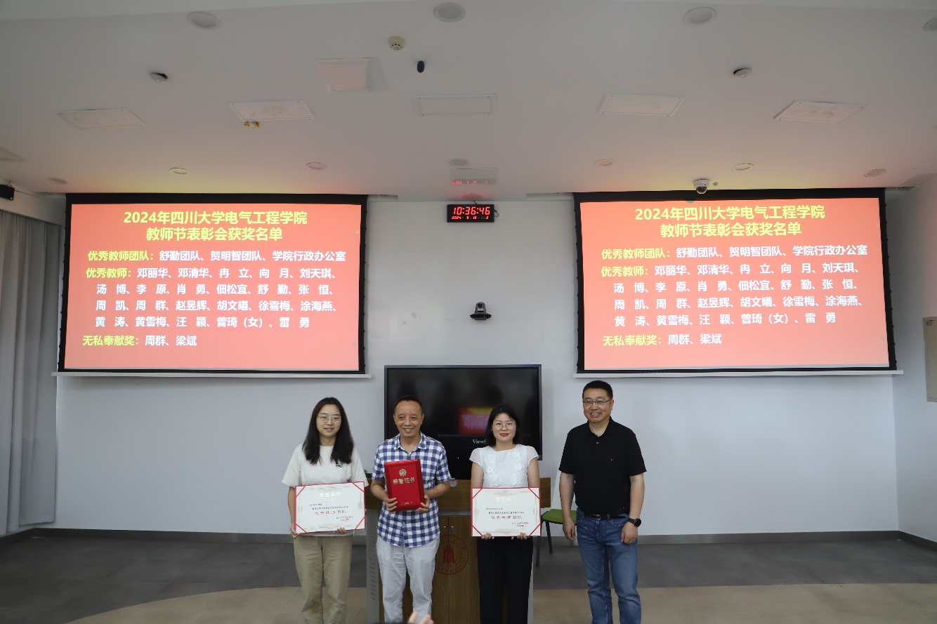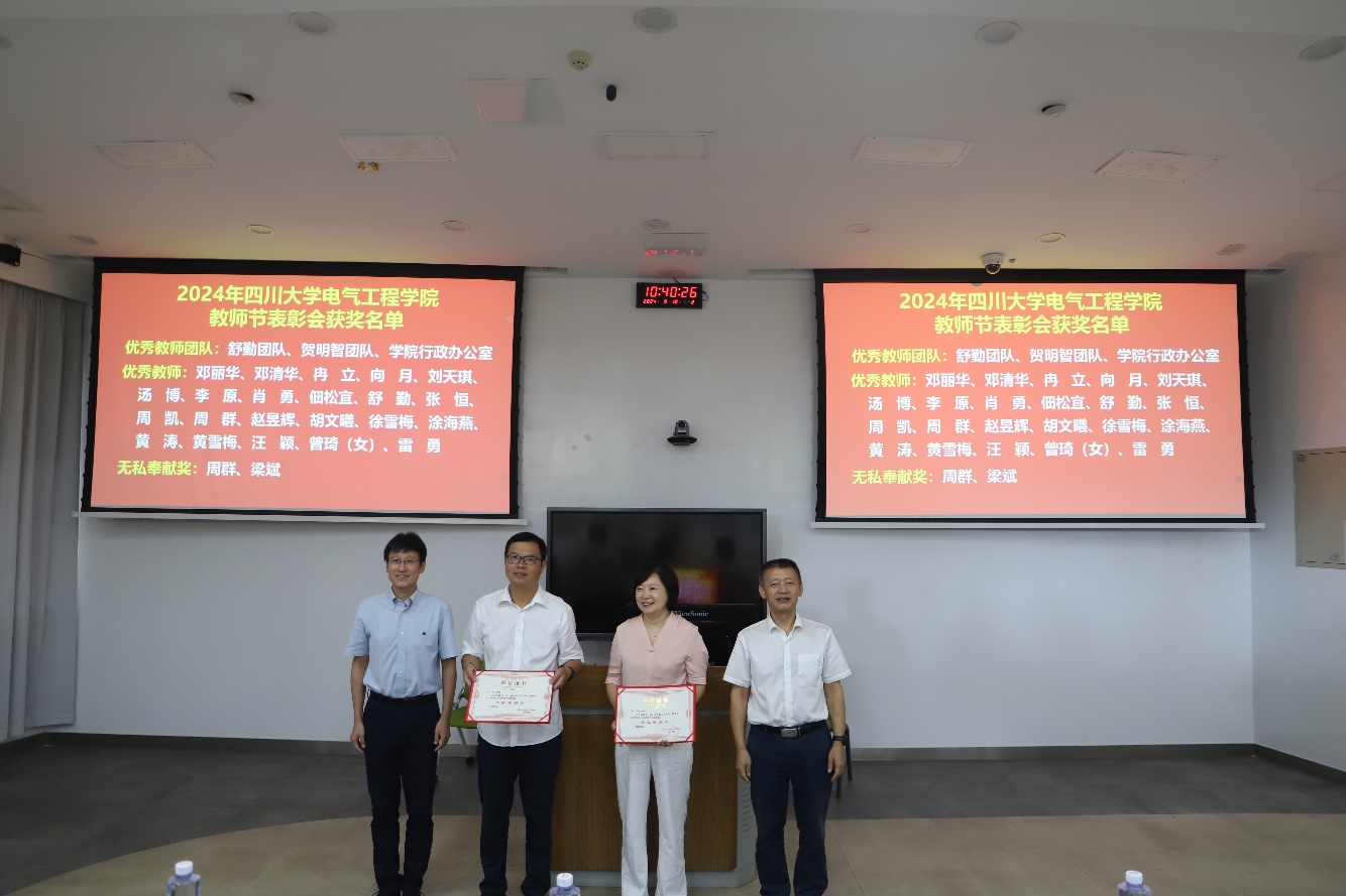 “无私奉献奖”代表周群教授分别作了发言,他们分享了自己对教书育人事业的感悟、热爱与追求,表示将继续传承和弘扬一代代川大电气人的高尚师德风范,潜心教书育人,静心科研创新,肩负起“为党育人、为国育才”的光荣使命。